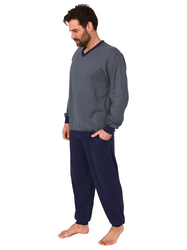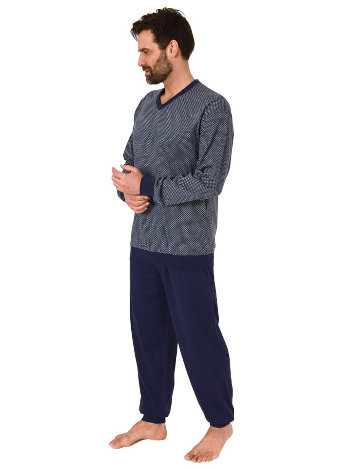 Красивая мужская пижама с длинными рукавами и манжетами элегантного вида. Вы любите хорошо одеваться и носить удобную и элегантную одежду для сна как днем, так и ночью? Тогда эта мужская пижама – идеальный выбор для вас! Элегантный минималистичный принт означает, что пижаму можно удобно носить в течение дня в качестве домашней одежды, но вы всегда произведете хорошее впечатление в этой пижаме и ночью.