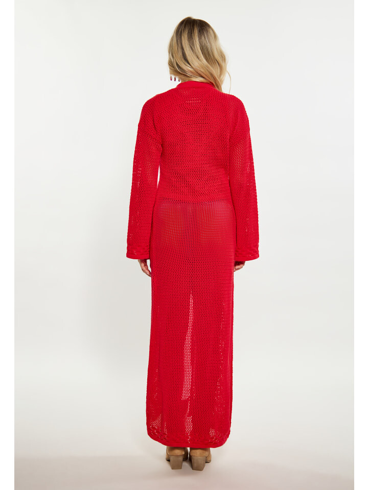 Представляем универсальный и стильный кардиган с V-образным вырезом и застежкой на пуговицы спереди. Изготовлен из уникальной сетчатой ткани с рисунком из равномерно расположенных отверстий для эффекта прозрачности. Ребристая текстура на манжетах и вдоль выреза придает элегантность и позволяет носить ее поверх любимых нарядов.