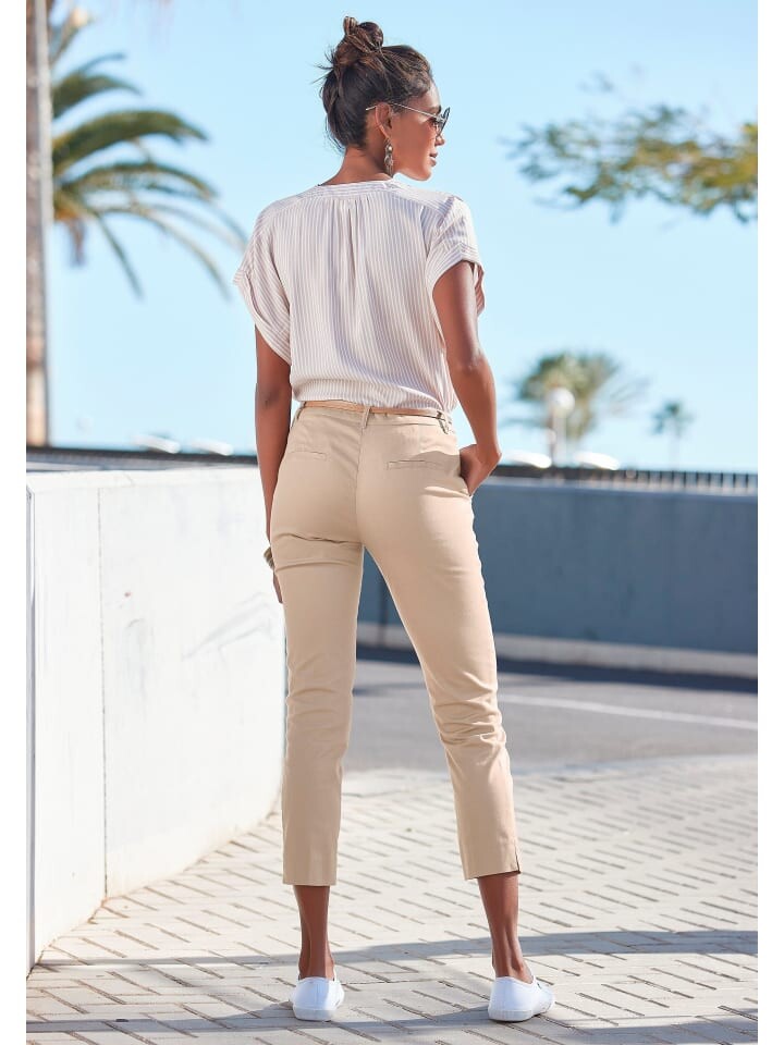 Брюки-чиносы с ремнем из искусственной кожи от VIVANCE. Боковые карманы, 2 накладных кармана сзади. Длина 7/8. Зауженная ножка с небольшим разрезом. Внутренняя длина штанины около 68 см. Изготовлен из 98% хлопка, 2% эластана. Ремень: 100% полиуретан.