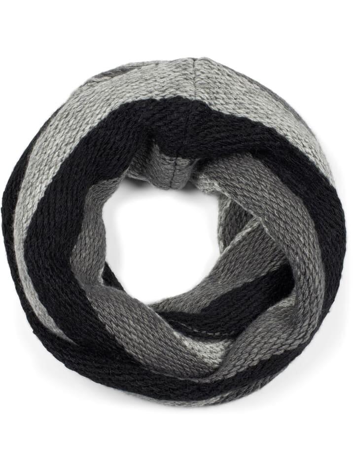 комплект styleBREAKER из вязаного шарфа-петли и шапки-бини с полосатым узором в согласованных цветах.