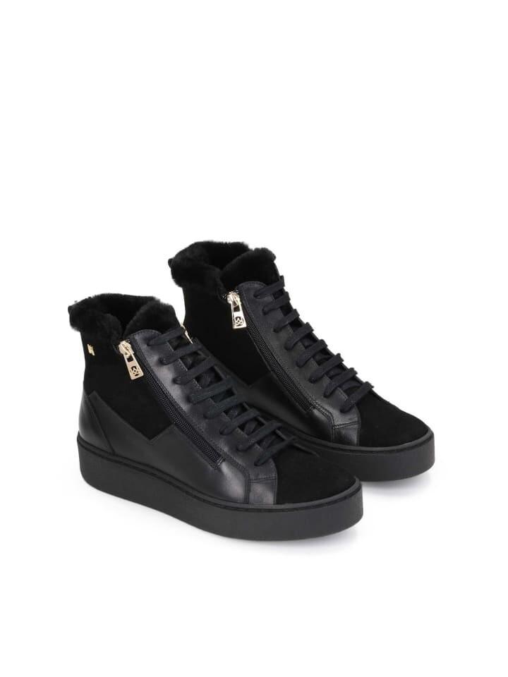 Черные женские кроссовки на толстой прямой подошве имеют невероятно оригинальный дизайн. Верх выше щиколотки выполнен из двух видов кожи: зерненой кожи и спилка. Сопоставление этих контрастных материалов дополнительно подчеркивается эффектными швами. Две молнии и традиционная шнуровка облегчают надевание обуви. Теплая, удобная обувь в спортивном стиле – идеальное дополнение к повседневному образу.