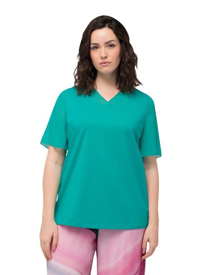 Футболка классического кроя с отделкой из прозрачного шифона на V-образном вырезе. Половинки рукавов из шифона.