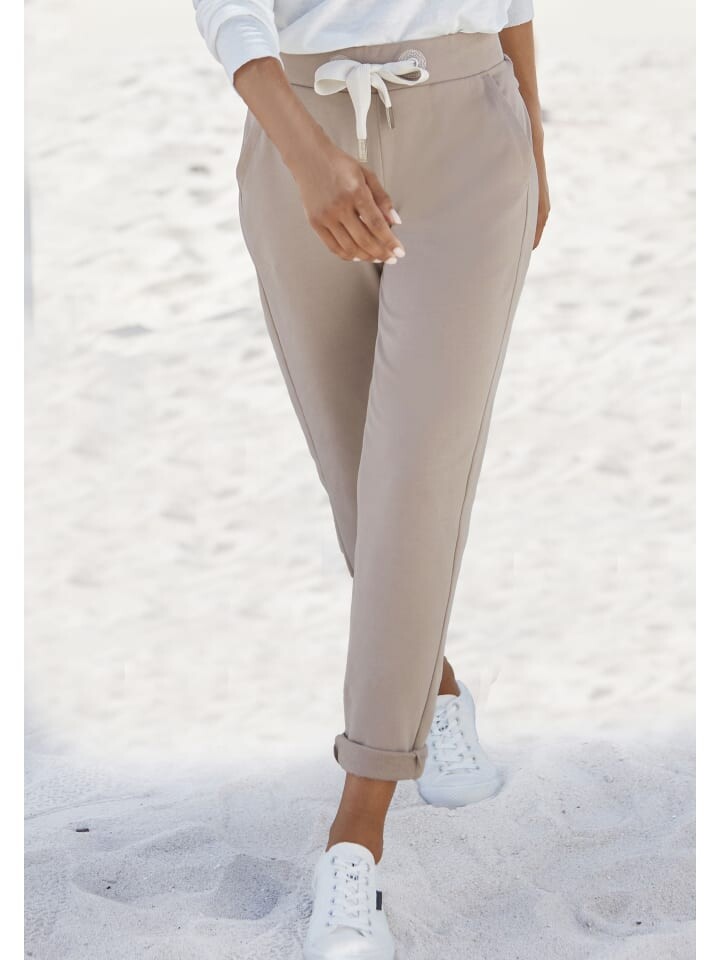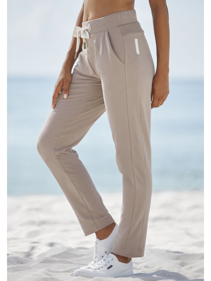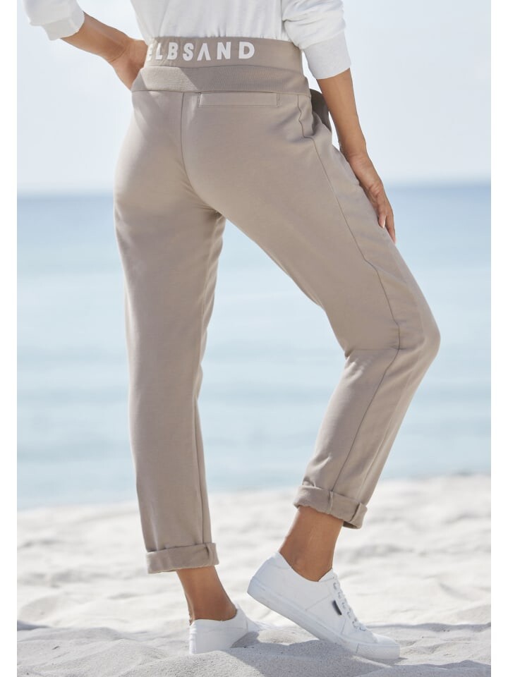 Спортивные штаны от ELBSAND с манжетами по подолу. Пояс с кулиской и флоковым принтом с логотипом сзади. Боковые карманы. Внутренняя длина штанины около 78 см. Изготовлен из 95% хлопка, 5% эластана.