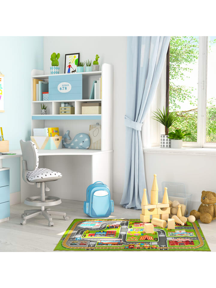 Заставьте глаза детей загораться с помощью этого игрушечного ковра. На мягком ковре изображены все важные здания небольшого городка. По двухполосной дороге мальчики и девочки могут ездить на игрушечной машине в такие места, как почта, полицейский участок, аэропорт или железнодорожный вокзал. Там есть железнодорожный маршрут, который полностью огибает дорожное покрытие. Коврик для игр в машину из полиэстера не скользит и его можно свернуть, чтобы сэкономить место, когда он не используется.