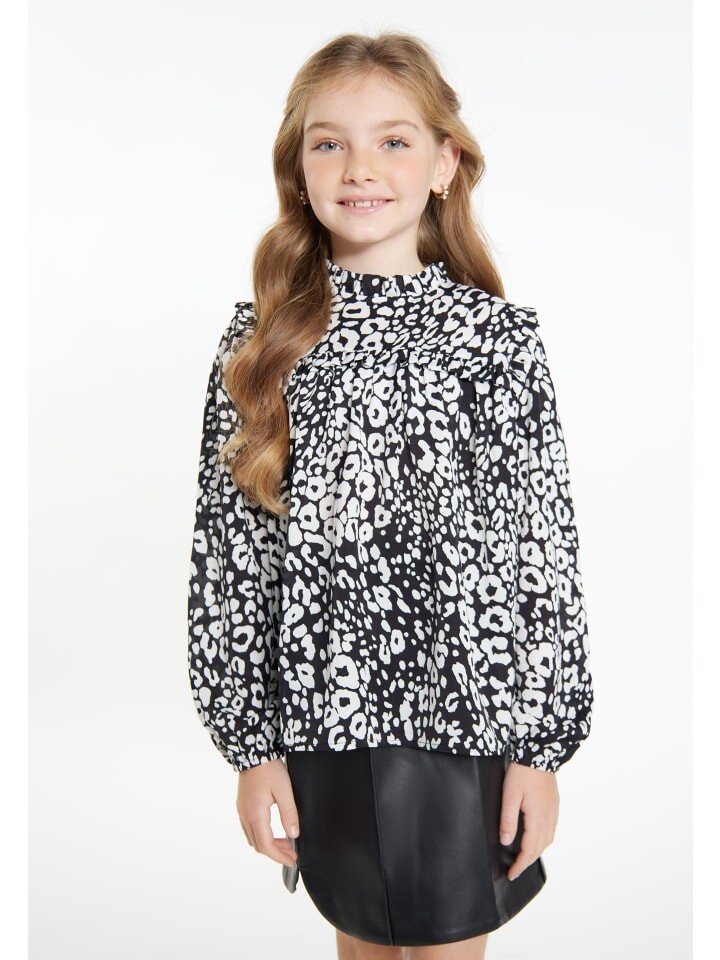 Блузка Фаина – незаменимая вещь в каждом гардеробе! Имеет интересный узор, воротник-стойку, длинные рукава и декоративную оборку спереди. Это шикарное изделие застегивается на пуговицу сзади и подходит как для официальных, так и для неформальных случаев.