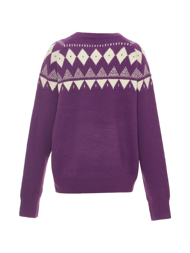 Женский свитер от ebeeza представляет собой жаккардовую вязку с круглым вырезом и ромбовидным узором в норвежском стиле.