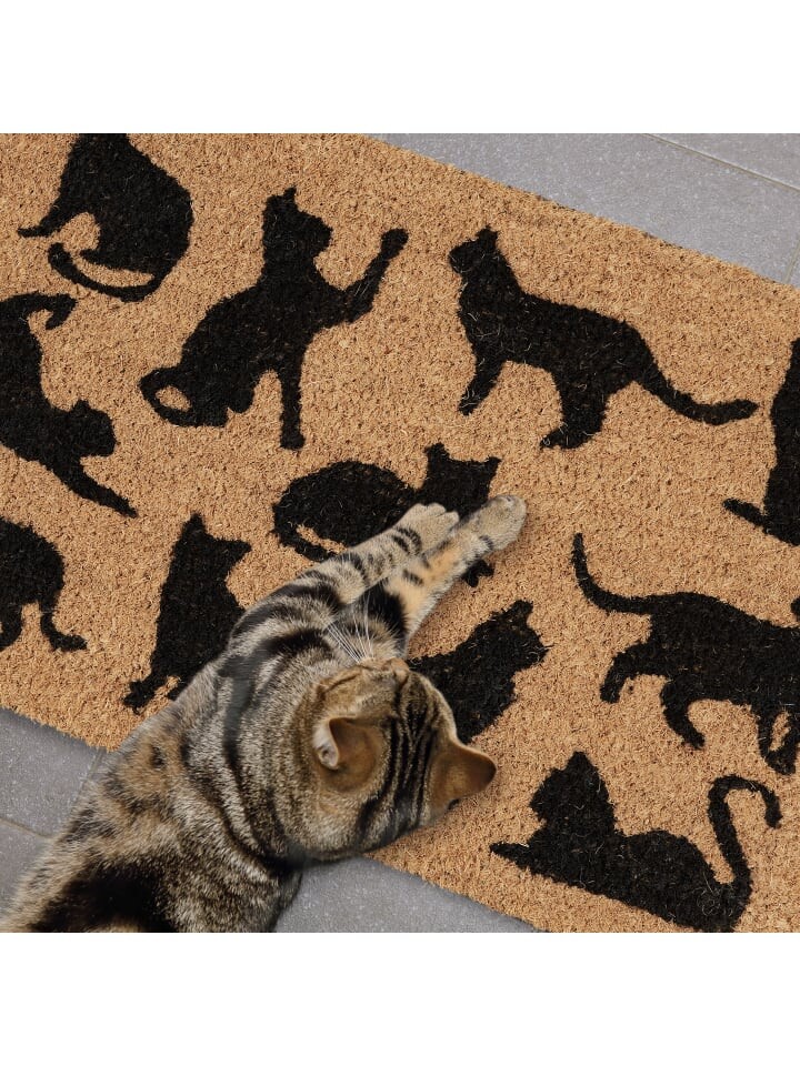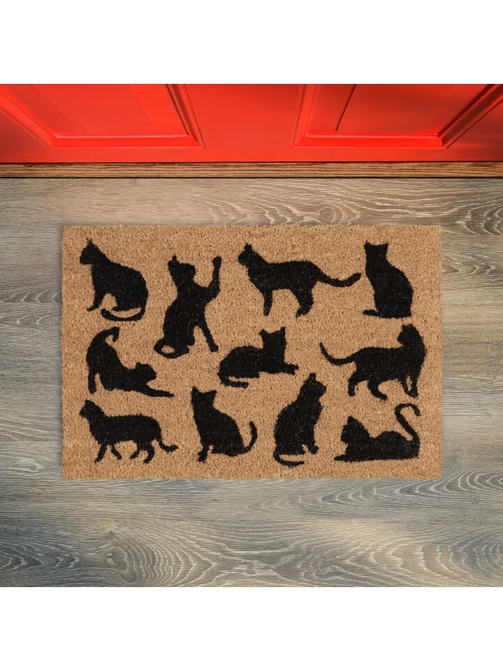 Этот милый коврик с черными котами в разных позах порадует ваших посетителей прямо у входа. Устойчивые и долговечные кокосовые волокна коврика гарантируют, что ваш дом останется чистым, а грязь останется снаружи. Благодаря ПВХ-покрытию на нижней стороне грязеуловитель остается на месте, даже если обувь придется носить интенсивно. Практичный и красивый декоративный элемент для квартиры, дома и сада.