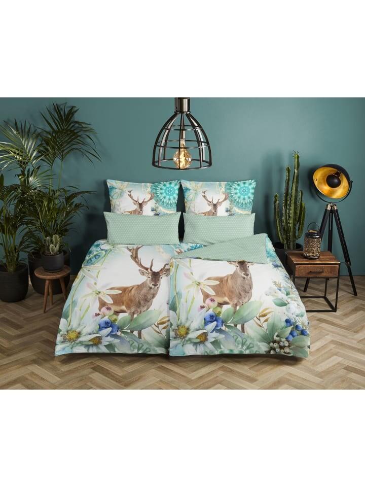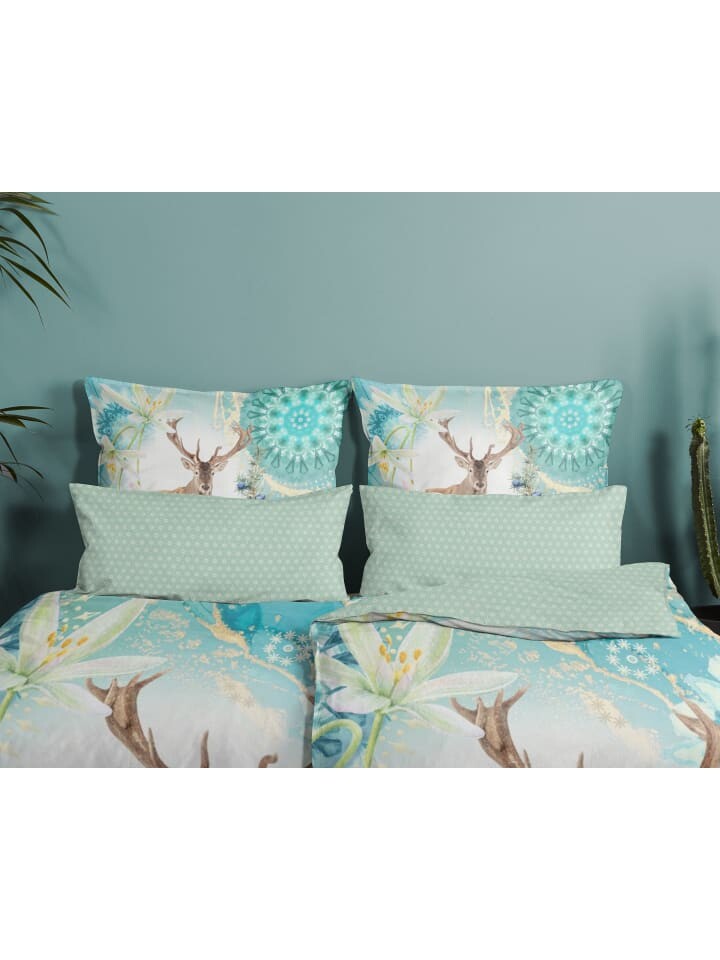 Постельное белье создано с привлекательным художественным мотивом, который представляет собой гармоничное сочетание мандал и величественного оленя. Мотив в основном выполнен в зеленом и синем цветах, что создает успокаивающую и естественную атмосферу.