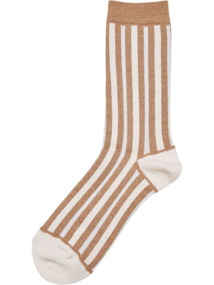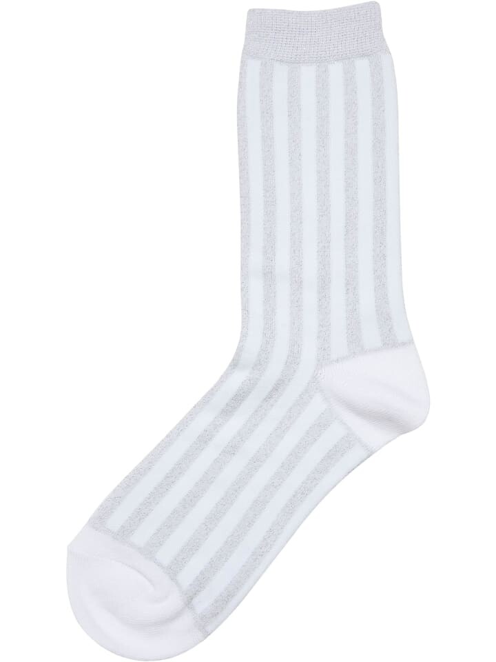 В тройной комплект входят три пары чулок с изысканным эффектом, созданным вертикальными полосками из металлизированной пряжи. Чулки имеют удобную высоту до икры, имеют тонкие эластичные манжеты и доступны в четырех размерах. Они изготовлены из хлопка, металлизированной пряжи, полиэстера и эластана.