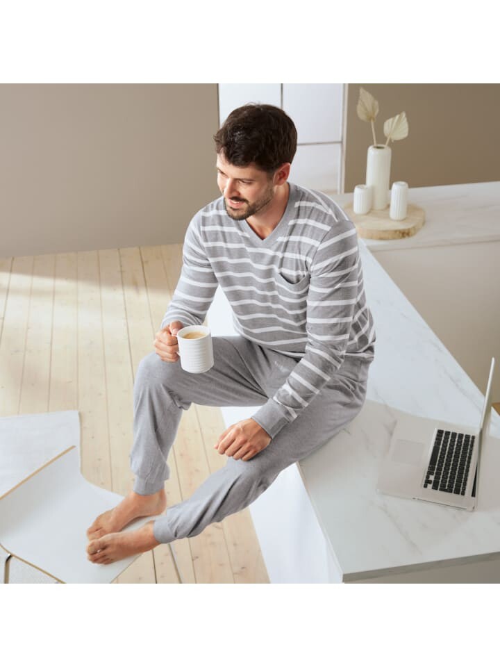Мужская пижама Erwin Müller из одинарного джерси. Для чистого комфорта. Пижама модного меланжевого цвета имеет спортивные манжеты на рукавах, подоле и штанинах. Цвет топа в трикотажные полоски с V-образным вырезом и нагрудным карманом прекрасно сочетается с длинными брюками с притачным эластичным поясом. Позвольте себе вдохновиться невероятным комфортом ношения и удобным кроем. Сны во сне сбываются в мягком, приятном и приятном качестве.