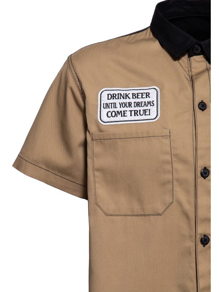 Будь то в мастерской, за кружкой пива после работы или на непринужденной встрече с друзьями — рубашка King Kerosin Worker станет идеальным спутником. Изготовленная из хлопка с содержанием эластана, она сочетает в себе комфорт и прочность. Два накладных нагрудных кармана, один с дополнительным карманом, а также нагрудные нашивки придают аутентичный вид рабочей одежде. Юмористические нашивки в виде «Все, что тебе нужно, это пиво». на спине и надпись «Пейте пиво, пока ваши мечты не сбываются» спереди вызывают улыбку и повод для разговора. Контрастный воротник «Кент», контрастные цветные швы и кокетка сзади расставляют модные акценты, а классический крой с закругленными краями подол обеспечивает свободную посадку.