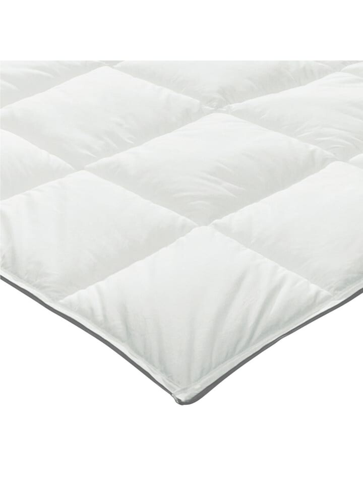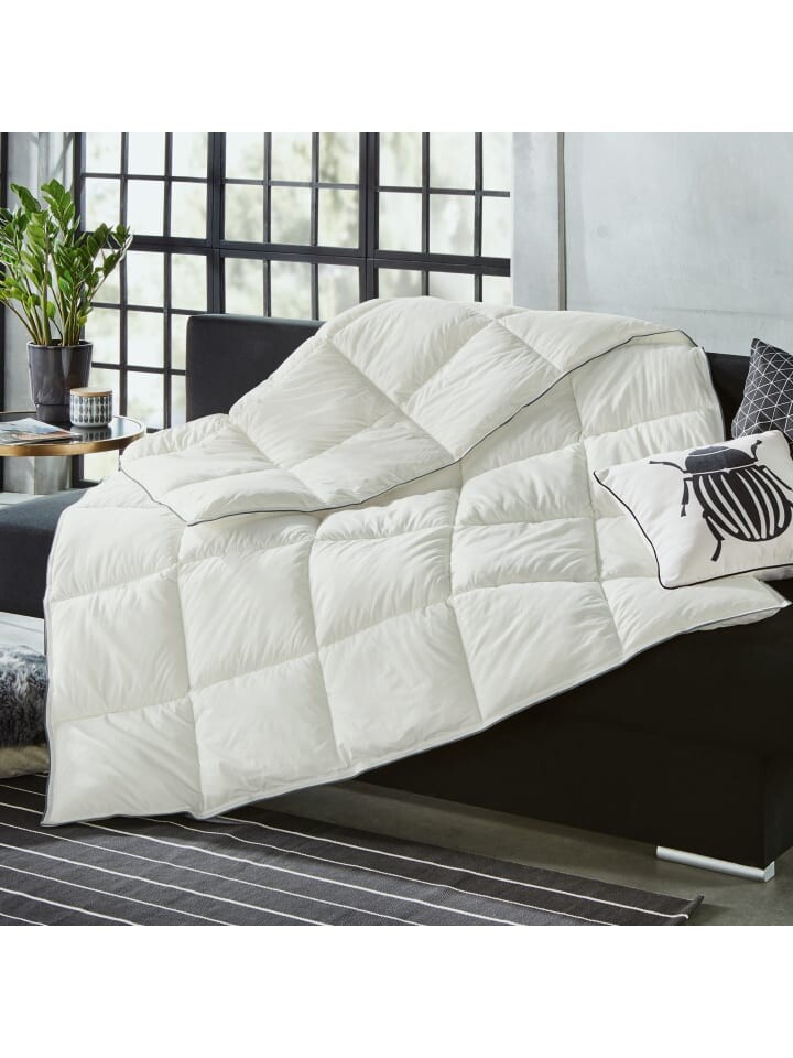 Одеяло-подтяжка Erwin Müller "Main". Благодаря инновационному наполнителю пуховое одеяло сочетает в себе преимущества натурального пуха с нечувствительностью синтетических волокон. Тончайший хлопок чехла окружен синтетическим высокотехнологичным волокном. Волокно, специально разработанное для производства постельных принадлежностей, состоит из двух компонентов, что придает ему типичную спиральную форму. Кроме того, через волокна проходят воздушные каналы, обеспечивающие тепловые характеристики выше среднего и очень хороший перенос влаги. Благодаря специальной структуре удельный вес значительно снижается и достигается потрясающий объем наполнения. Волокно также обладает огромной эластичностью и поэтому чрезвычайно прочно и легко моется. Визуально подчеркнут цветной окантовкой.