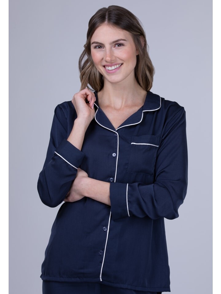 Эта бархатистая и качественная атласная женская пижама позволит вам хорошо выспаться и в то же время выглядеть очень элегантно. Удобный крой обеспечивает необходимую гибкость и позволяет использовать костюм-двойку в качестве костюма для отдыха. Топ со сплошной планкой на пуговицах и шикарными контрастными полосками придает ему вневременной, но модный характер. Ночной костюм также имеет воротник с лацканами и нагрудный карман. Брюки имеют удобный эластичный пояс для оптимальной посадки. 100% полиэстер; Стирать при 30°C, не отбеливать, сушить в стиральной машине, не гладить, не подвергать химической чистке