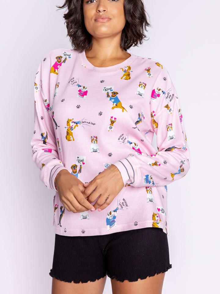 Пижамный топ Woof for Love от PJ Salvage украшен милым игривым принтом в виде собаки и полосатыми ребристыми манжетами. Изготовлен из уютной термоткани с добавлением хлопка. Правильный компаньон для уютных часов!