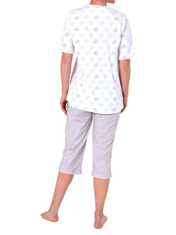 Эти абстрактные графические сердечки выглядят как тысяча маленьких сердечек на этой невероятно красивой пижаме-капри с полурукавами от Normann. Капри длиной 3/4 идеально сочетаются с цветом пижамного верха-капри. Боковые карманы пижамы с короткими рукавами модно завершают образ. Это ночное белье изготовлено из высококачественного хлопка. Вы можете носить эти пижамы-капри от Normann не только для сна, но и как уютную домашнюю одежду.