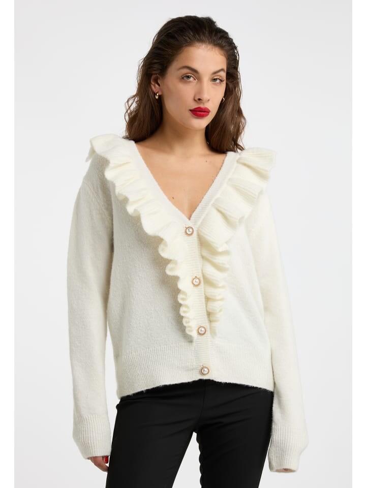 Этот кардиган от Faina поражает своей элегантной игривостью. Мягкая смесовая пряжа имеет женственный V-образный вырез, дополненный рюшами. Элегантные золотистые пуговицы украшены жемчугом и придают модели роскошную нотку.