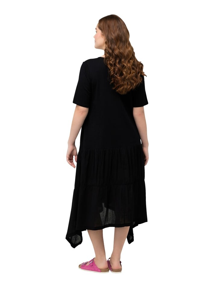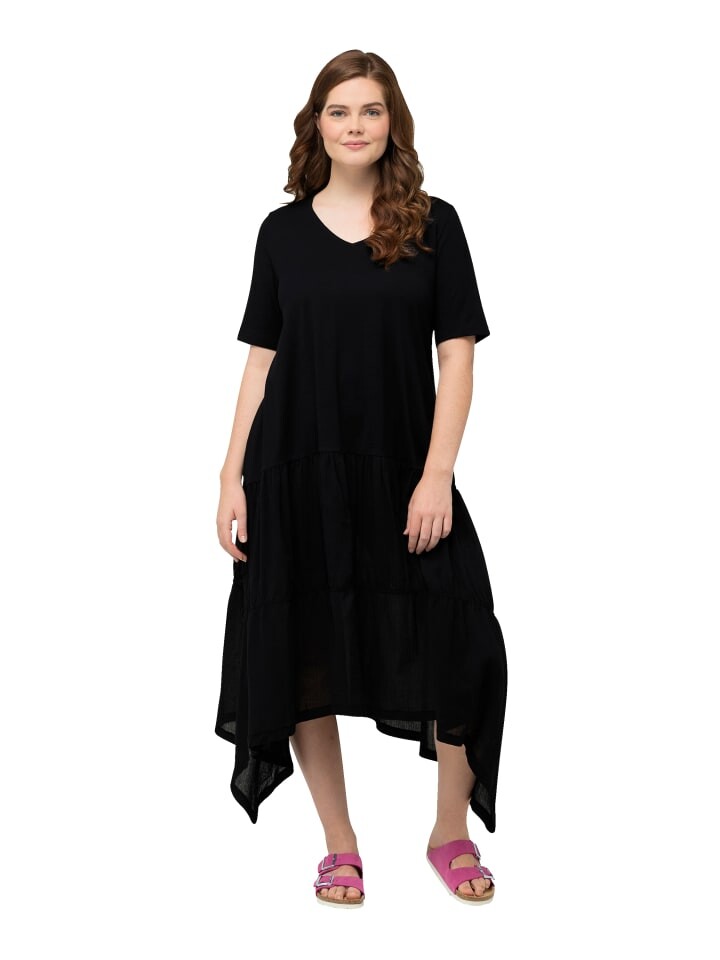 Платье миди из органического хлопка. Мягкий трикотаж тонкой структуры, универсальной длины миди, удобного А-силуэта. Привлекает внимание: тканые воланы по подолу. Округленный V-образный вырез, полурукава, карманы в боковых швах. Органический; сертифицирован ECOCERT Greenlife, лицензия № 152026.