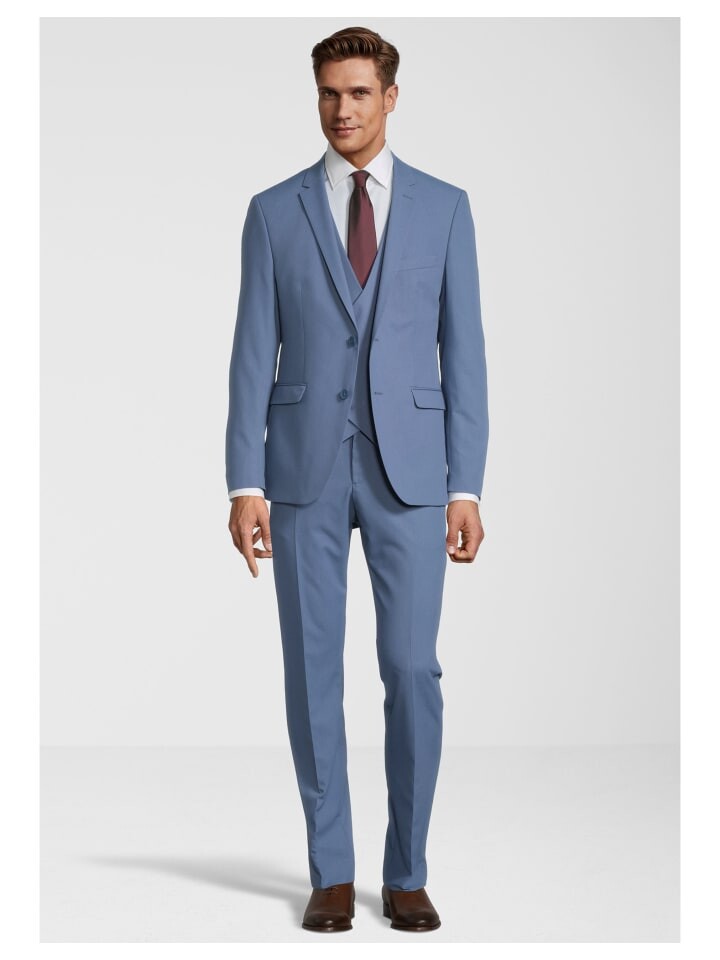 - Современный облегающий- прилегающий костюм с двубортным жилетом с регулировкой по ширине, элегантными костюмными брюками на узких штанинах и жакетом с однобортной застежкой