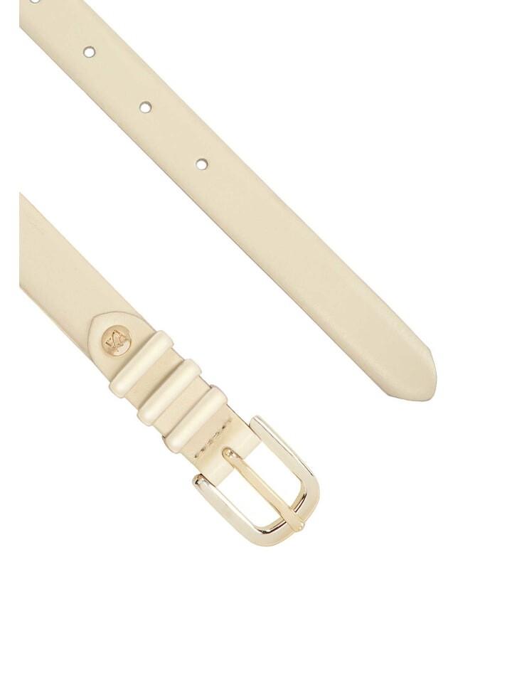Кожаный верхний ремень – незаменимая вещь в женском гардеробе. Облегающая модель, выполненная в неподвластном времени минималистичном стиле, подойдет в качестве аксессуара не только к брюкам, но и к платьям и пальто. Небольшая круглая пряжка и три металлические петли красиво смотрятся в сочетании с черной кожей.