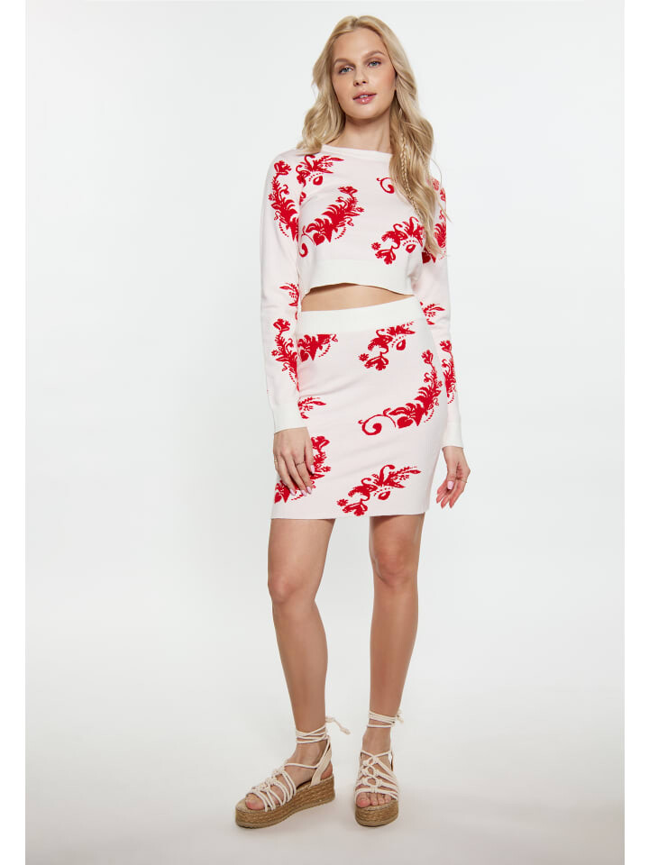 Представляем нашу юбку-карандаш с традиционным узором из туалетной ткани с замысловатыми цветочными и листовыми мотивами. Эластичный пояс позволяет надевать, а эластичный трикотаж обеспечивает идеальную посадку для любой фигуры.