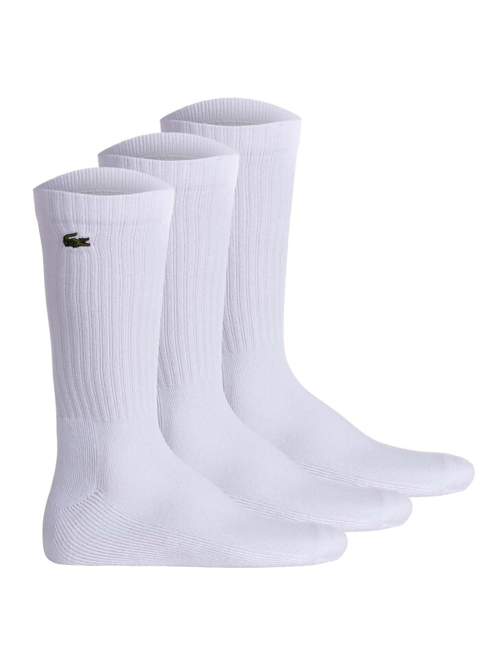 Теннисные носки унисекс LACOSTE из высококачественной смеси хлопка в упаковке по 6 штук. Однотонный цвет с маленькой этикеткой LACOSTE из крокодиловой кожи.