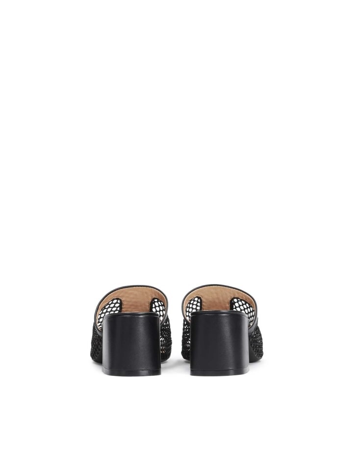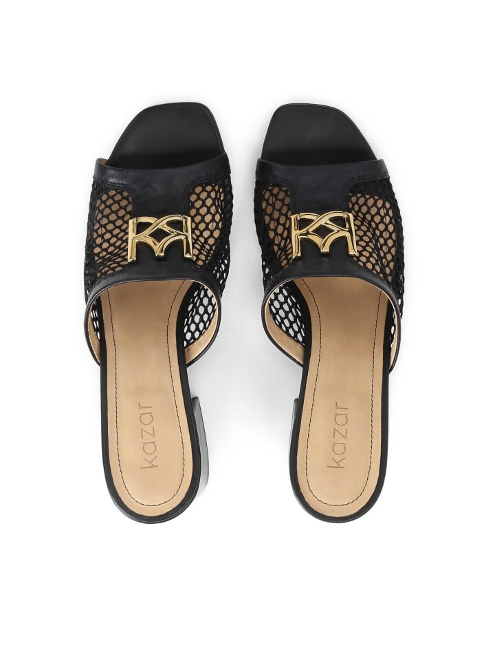 Женские мюли на широком каблуке с ажурным ремешком из ткани и зерненой кожи идеально подходят для жарких дней. Привлекательный дизайн делает представленную модель интересным дополнением многих стилей, как повседневных, так и официальных. Крупный металлический орнамент в виде монограммы KAZAR выглядит чрезвычайно элегантно и шикарно.