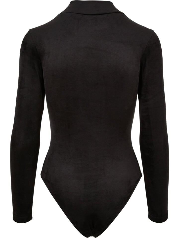Женское боди из мягкого бархата и эффектным вырезом привлекает внимание. Над грудью полукруглый вырез. Комбинезон также имеет высокую водолазку и длинные рукава. Посадка облегающая и поэтому близка к фигуре. Боди закрывается на кнопки в промежности.