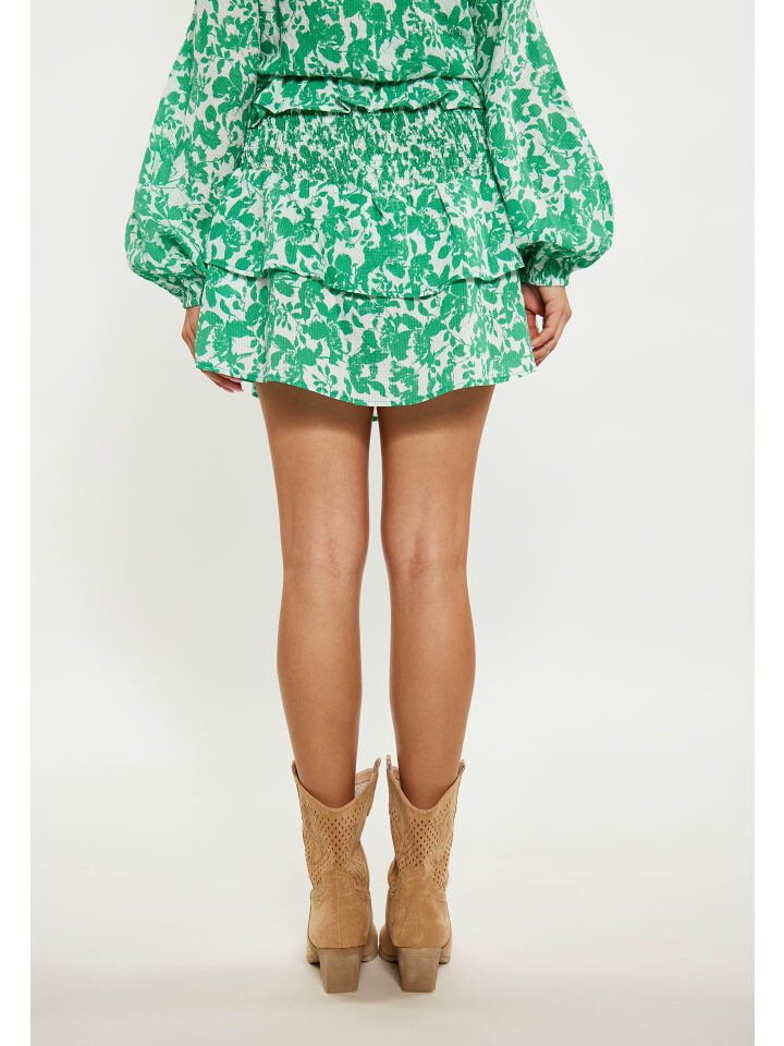 Эта многоярусная юбка с очаровательным цветочным узором станет восхитительным дополнением вашего гардероба. Несколько слоев с рюшами по краям создают игривый и объемный силуэт. Эластичный пояс обеспечивает удобную посадку, а легкая ткань обеспечивает плавность движений. Эта короткая юбка, идеально подходящая для повседневных прогулок, излучает беззаботную и бодрую атмосферу и заканчивается выше колена.