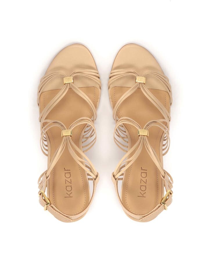 Уникальные босоножки из высококачественной кожи красивого блестящего золотого тона, привлекающие внимание и добавляющие гламура любому образу, являются символом элегантности и классической красоты. Их необычный дизайн сочетает в себе традиции и современность. Многочисленные изящные ремешки, опоясывающие плюсну, являются не только украшением, но и функциональным элементом, позволяющим идеально адаптироваться к форме стопы. Изысканная металлическая застежка с монограммой KAZAR придает дополнительный шарм и подчеркивает эксклюзивный характер. Эти босоножки – квинтэссенция женственного стиля. Благодаря своему уникальному цвету и дизайну они прекрасно дополняют вечерний наряд и придают ему законченность, достойную красной ковровой дорожки.