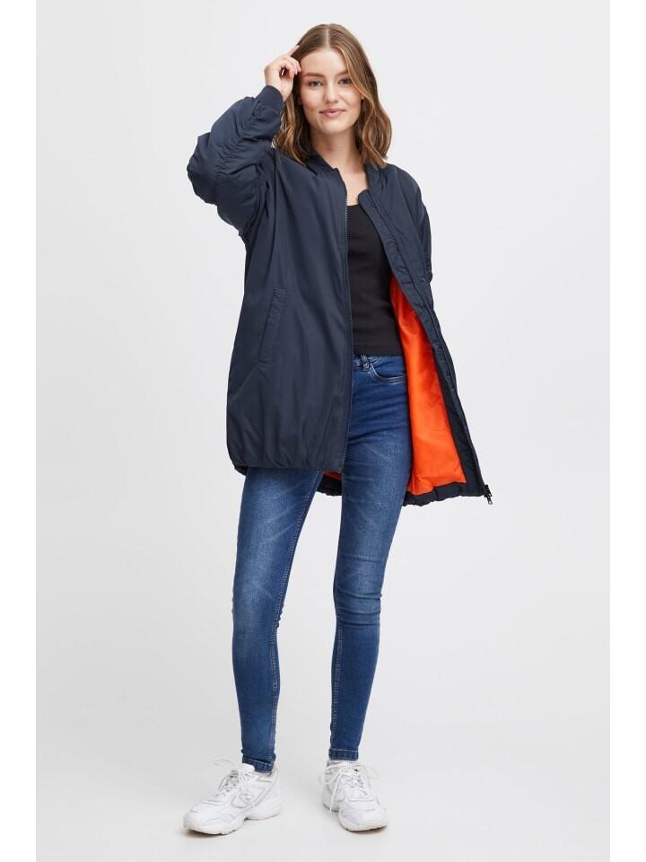 ДЕТАЛИ И ОСОБЕННОСТИ: Зимняя куртка, крой oversize, застежка на пластиковую молнию, эластичные манжеты с ребристыми манжетами, два боковых кармана, слегка завышенные плечи, подкладка контрастного цвета (неоново-оранжевая), двусторонняя молния, присборенный низ, теплая подкладка, блузон. воротник, прямой низ со скрытой резинкой
