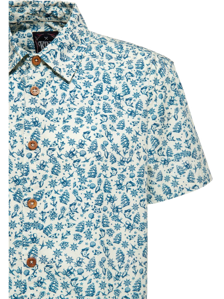 Отправляйтесь в новое модное приключение с рубашкой King Kerosin с короткими рукавами, украшенной впечатляющим принтом в стиле матросской татуировки. Этот дизайн отдает дань уважения отважным морякам и их культовым татуировкам, говорящим о свободе и приключениях в открытом море. Эта рубашка с классическим воротником «Кент» и деревянными пуговицами сочетает в себе стиль и функциональность. Закругленный низ и стандартный крой создают повседневный, но ухоженный вид. Эта рубашка, изготовленная из 100% органического хлопка на сертифицированном GOTS производственном предприятии, сочетает в себе экологичность и винтажный стиль.