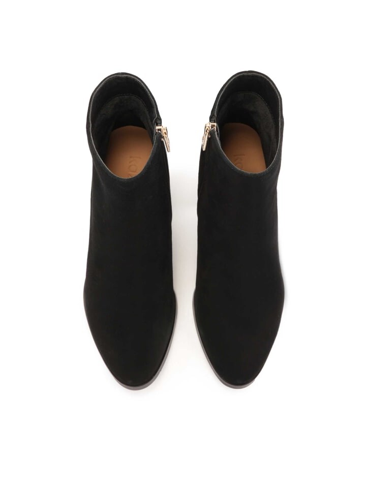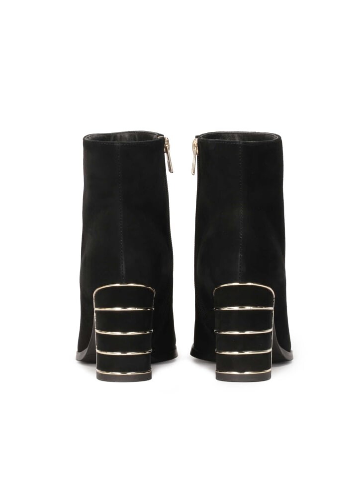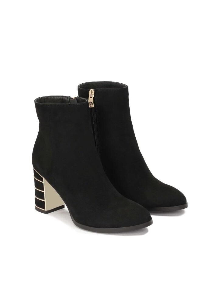 Сапоги на молнии простого узкого кроя — универсальная и неподвластная времени модель. Минималистский стиль дополнен элегантным металлическим элементом на пятке. Горизонтальные золотые полосы создают интересный визуальный эффект. Черные ботинки из мягкой замши подходят как для повседневного стиля, так и для повседневного выхода в свет. Подкладка из мягкого полуанилина из козьей кожи гарантирует высокий уровень комфорта, а подкладка из меховой ткани создает ощущение тепла в холодные дни.
