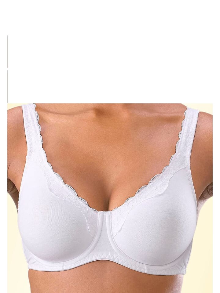 С бесшовными, предварительно сформированными, двухслойными чашками (без набивки). Красивая кружевная лента по краю чашки. Регулируемые бретели и застежка сзади. Бюстгальтер на косточках изготовлен из 85% хлопка, 10% полиамида, 5% эластана. Бюстгальтеры не подходят для сушки в сушильной машине, так как регуляторы и кольца повреждаются под воздействием тепла и ломаются.