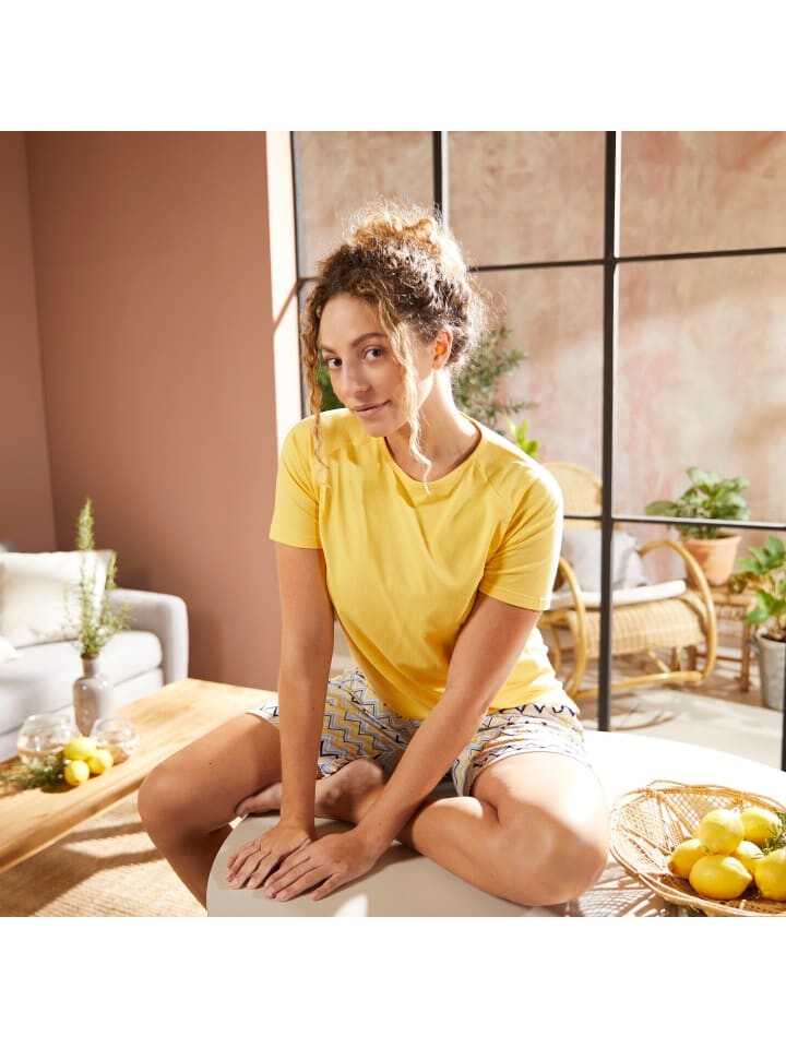 Женские шорты из одинарного джерси Erwin Müller. Для чистого комфорта. Удобный крой приглашает вас расслабиться. Шорты с зигзагообразным принтом по всей поверхности сочетаются с верхом с круглым вырезом и рукавами реглан. Имеет боковые карманы и идеально сидит благодаря широкому комфортному поясу. Пижама для сна, изготовленная из мягкой, струящейся и эластичной смеси материалов, дарит коже мягкость и комфорт. Он обеспечивает превосходный комфорт при ношении, дышит и прост в уходе.