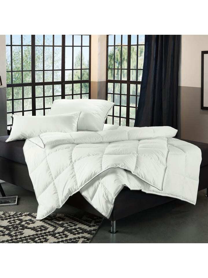 Одеяло-подтяжка Erwin Müller "Main". Благодаря инновационному наполнителю пуховое одеяло сочетает в себе преимущества натурального пуха с нечувствительностью синтетических волокон. Тончайший хлопок чехла окружен синтетическим высокотехнологичным волокном. Волокно, специально разработанное для производства постельных принадлежностей, состоит из двух компонентов, что придает ему типичную спиральную форму. Кроме того, через волокна проходят воздушные каналы, обеспечивающие тепловые характеристики выше среднего и очень хороший перенос влаги. Благодаря специальной структуре удельный вес значительно снижается и достигается потрясающий объем наполнения. Волокно также обладает огромной эластичностью и поэтому чрезвычайно прочно и легко моется. Визуально подчеркнут цветной окантовкой.