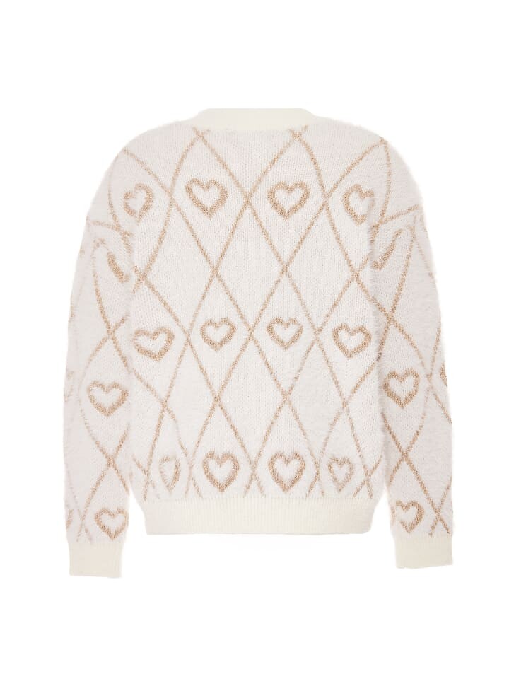 Вязаный свитер от ebeeza из смеси ворсованной пряжи имеет слегка ворсистый вид и чувственный узор в виде сердечек из металлизированной пряжи золотистого цвета. В дополнение к классической форме он отличается вырезом на плечах и ребристыми трикотажными манжетами на конце.