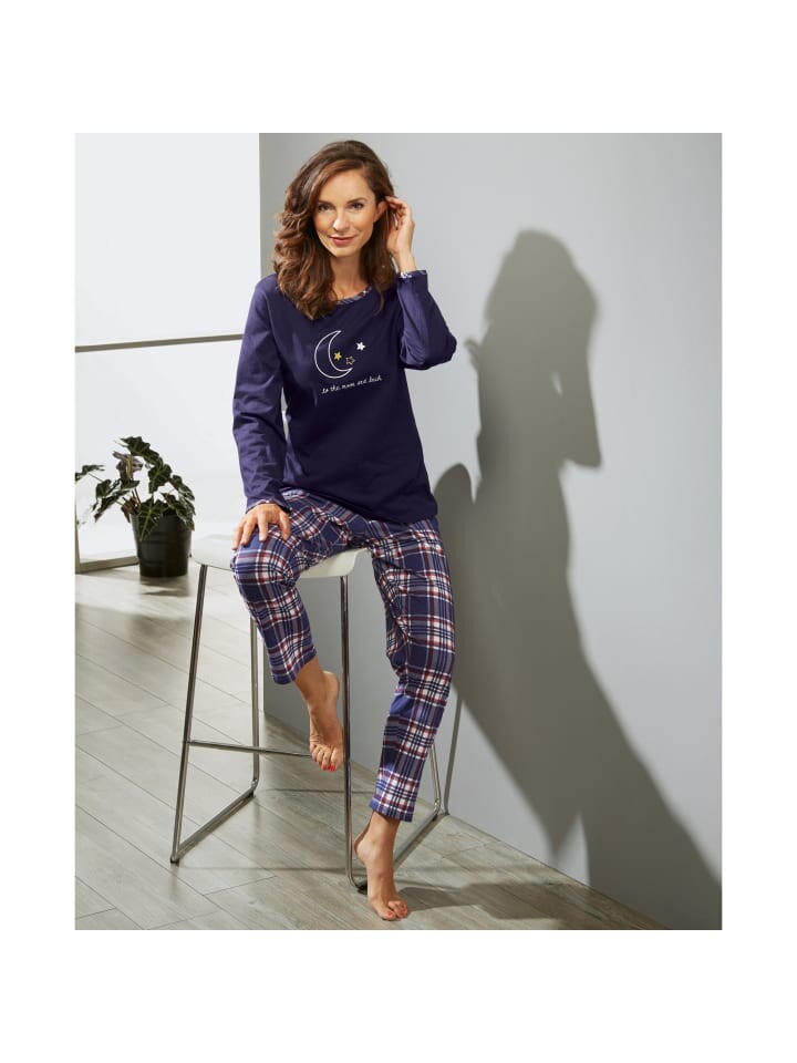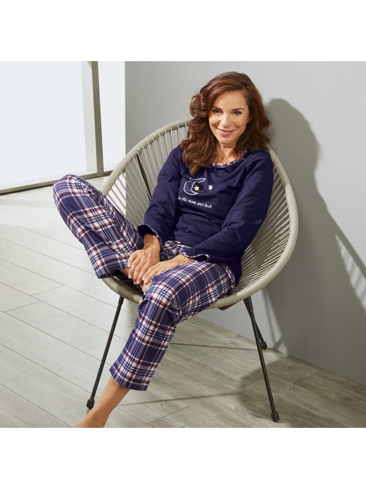 Женская пижама из одинарного джерси Erwin Müller. Сочетание любовного принта, простой и классической клетки выглядит современно и непринужденно. Окантовка горловины и рукавов топа идеально сочетается с длинными брюками с притачным эластичным поясом, кулиской и боковыми карманами. Вы будете рады побаловать себя приятным качеством, мягкостью, хорошей посадкой и комфортом. Приятная вещь, приятная для кожи и дышащая.