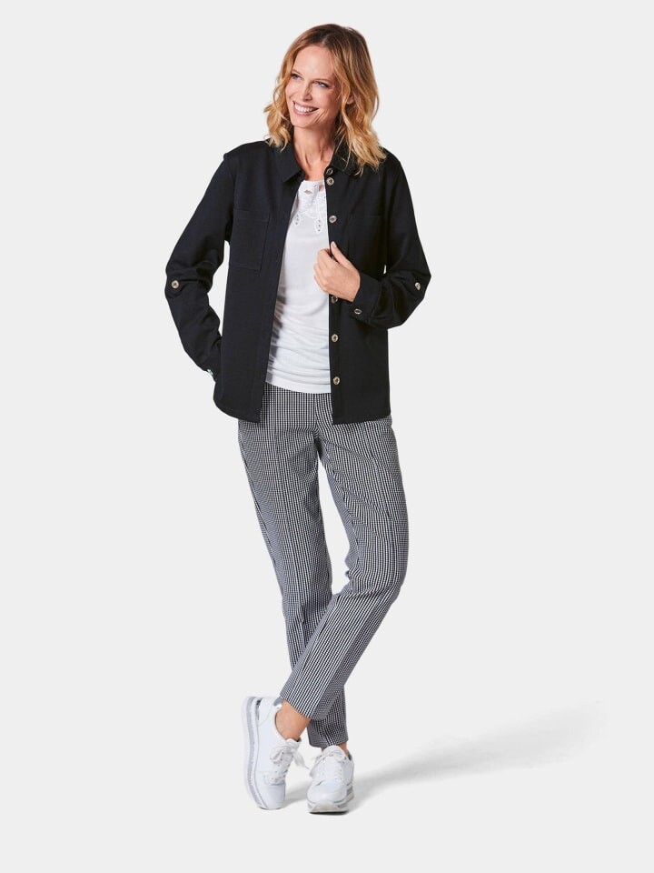 Куртка-рубашка из сверхмягкого вискозного трикотажа модного силуэта: модный вид и максимальный комфорт. Повседневная комбинация-звезда прекрасно сочетается с узкими брюками. Прилегающий к фигуре крой с небольшими разрезами по бокам. Накладные карманы и закатанные рукава придают модели элегантный спортивный вид. Высококачественные металлические пуговицы дополняют образ. Длина около 71 см по размеру. 46, размер около 67 см. 23.