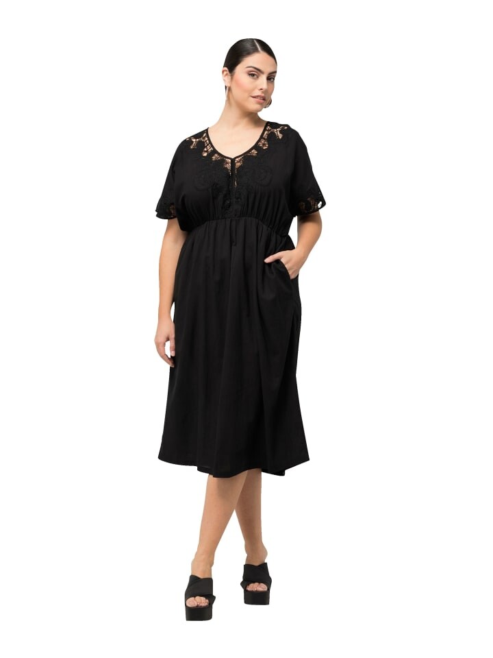 Платье оверсайз, воздушное, с прозрачной вышивкой на V-образном вырезе, заниженной линией плеч и полурукавами. Эластичный присборенный поперечный шов, карманы в боковых швах.