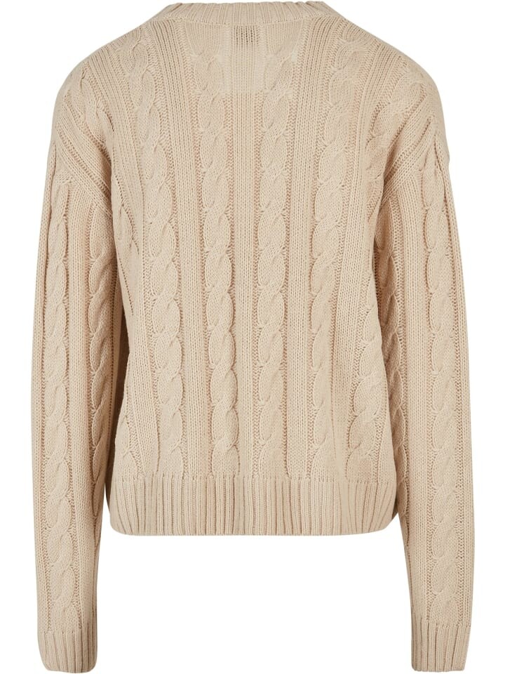 Мужской кардиган впечатляет своим повседневным свободным кроем или кроем оверсайз и типичными деталями вязаного мужского жилета - глубоким V-образным вырезом, заканчивающимся планкой с тремя большими пуговицами, а также крупным узором-косой. Образ в стиле «олдскуль» завершают широкие ребристые манжеты на рукавах и подоле, а также перекрывающиеся плечи. Вязаный жилет изготовлен из приятного мягкого акрила.