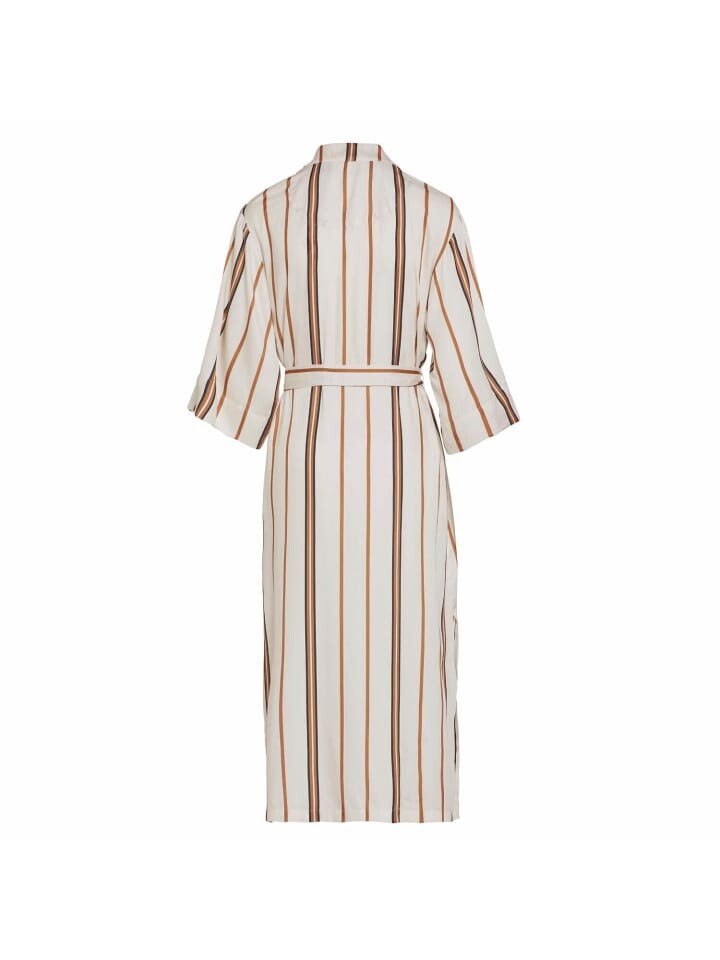 Классический узор в современной интерпретации: кимоно Essenza «Ilona Meryl» размера S шикарного ванильного или кремового тона с полосками разных цветов. Благодаря свободно ниспадающим рукавам 3/4, завязывающемуся поясу и длине до щиколотки халат становится повседневным спутником - будь то за завтраком, перед сном или в спокойный вечер на выходных.