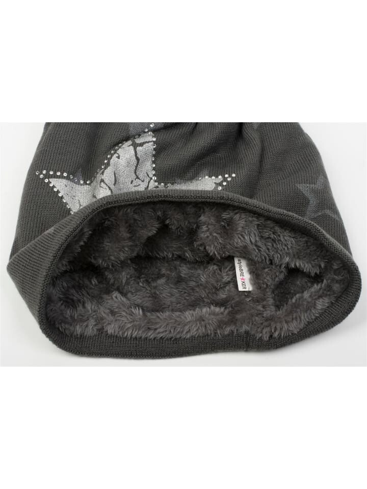 Мягкая шапка-бини styleBREAKER с винтажным принтом в виде звезд по всей поверхности, краями со стразами и теплой флисовой подкладкой в стиле Тедди.