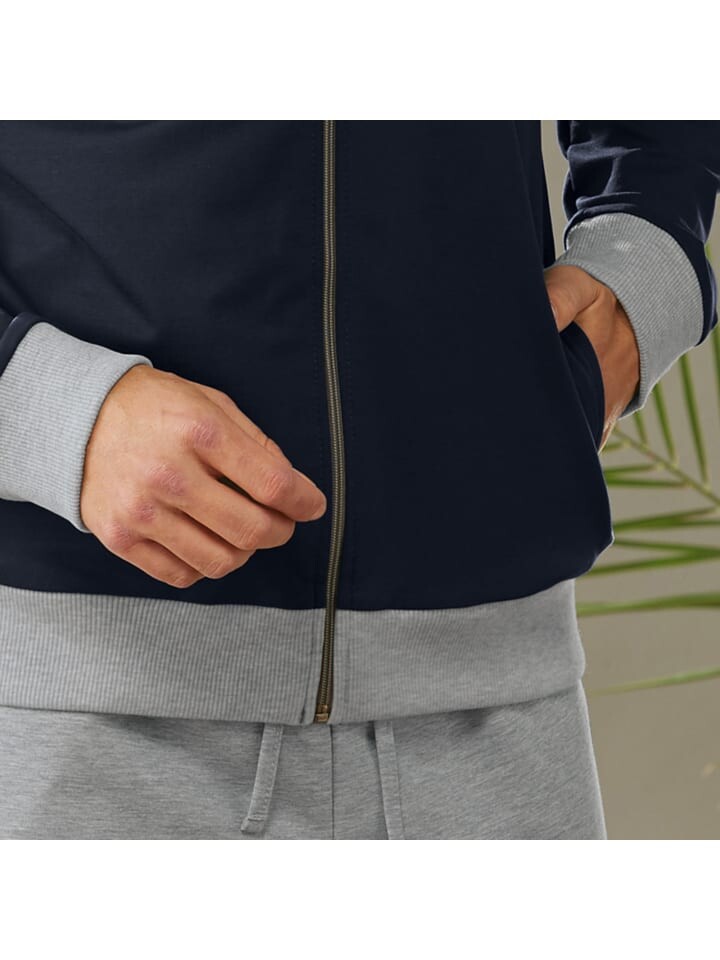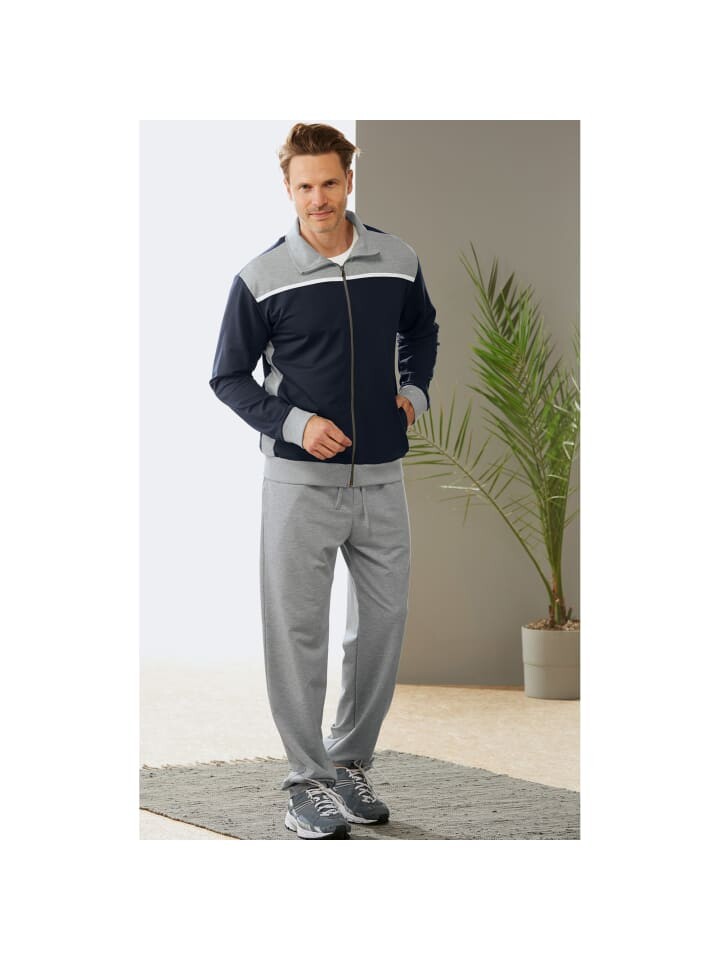 Мужской костюм для отдыха Erwin Müller Sweat. Ваш идеальный партнер для спорта и отдыха. Повседневный костюм-двойка невероятно удобен. Как куртка с молнией во всю длину, отложным воротником, цветными вставками и манжетами и манжетами по низу, так и однотонные брюки с притачным эластичным поясом и кулиской имеют боковые карманы. Мягкое и эластичное качество гарантирует удобную посадку.