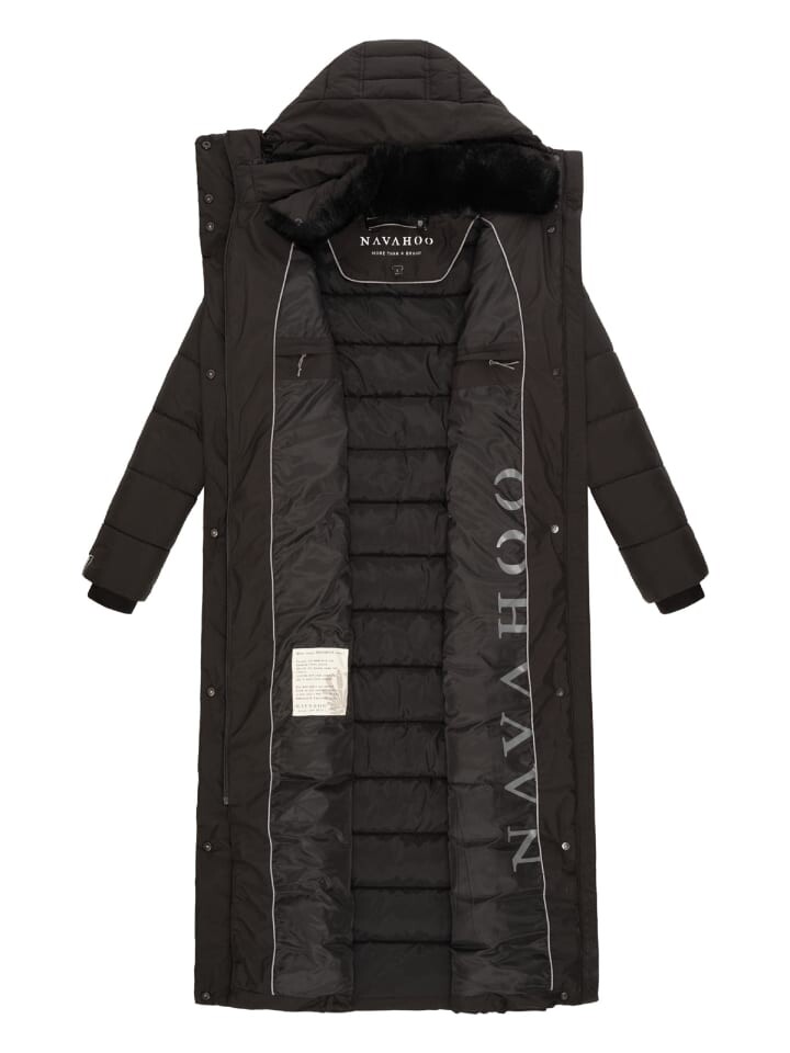 ВИД: Модное стеганое зимнее пальто от Navahoo модной длины до икр и множеством деталей, таких как уютный, теплый воротник на подкладке из искусственного меха и стильный поясной ремень. МАТЕРИАЛ: Куртка из матового блестящего, нескользящего внешнего материала. и с шелковистой стеганой внутренней подкладкой, которая благодаря теплой, но легкой подкладке приглашает вас прижаться; съемный воротник из искусственного меха сохраняет тепло шеи, как шарф. ПОДХОД: Элегантное пальто большой длины примерно до середины икры, удобного прямого кроя; для тех, кто хочет подчеркнуть свои изгибы: ширину талии можно регулировать с помощью поясного ремня (который фиксируется петлями для ремня). ДЕТАЛИ: 2 кармана на молнии не только сохранят ваши руки в тепле, но и вместе с ними. внутренние карманы предлагают много места для хранения вещей; Благодаря укороченной (водонепроницаемой) передней молнии и боковым разрезам пуховик обеспечивает достаточную свободу движений