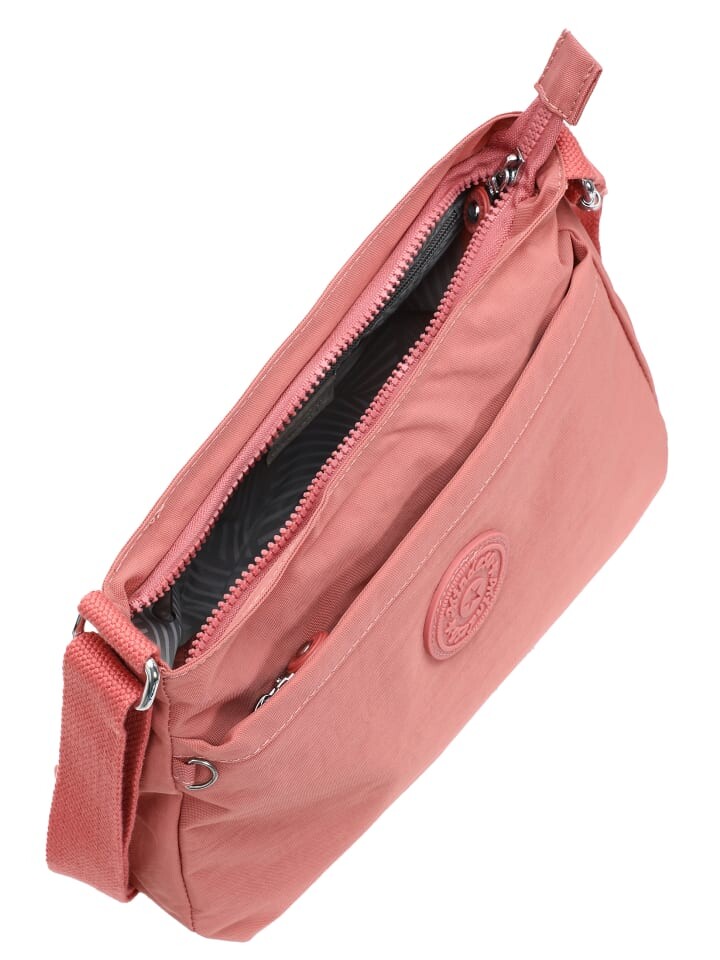 Эта сумка через плечо оснащена одним регулируемым ремнем, закрепленным элегантной металлической фурнитурой. Его прямоугольная форма с закругленными углами создает ощущение мягкости и гибкости. На лицевой стороне изображен тисненый круглый логотип со звездообразным символом в центре, окруженным текстом. Горизонтальная передняя молния обеспечивает доступ к внешнему карману, а основное отделение закрывается верхней молнией.