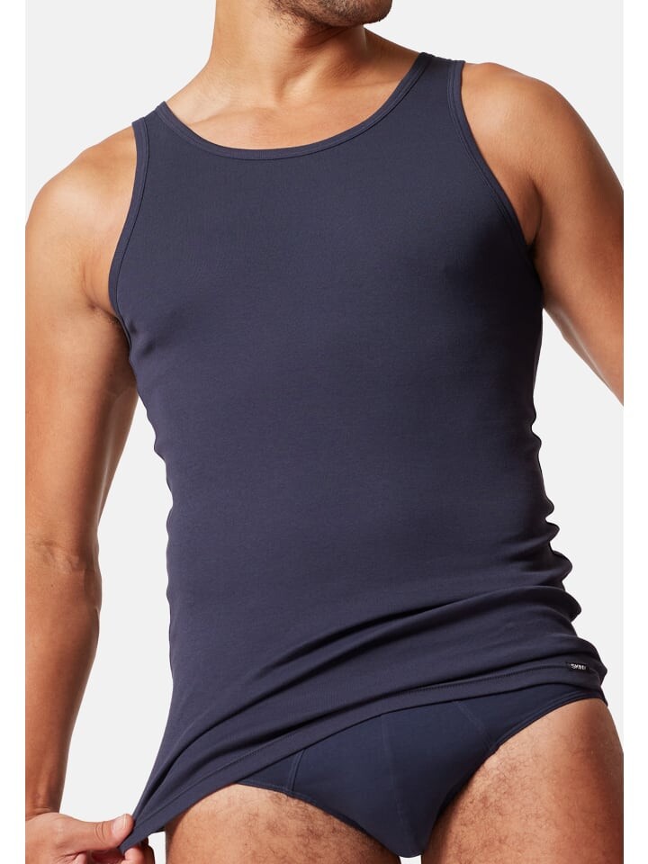 Мужская майка изготовлена из 100% прочного хлопка с тонкими ребрами и поэтому очень удобна. У него круглый вырез, а изюминкой является небольшой логотип бренда в нижней части спереди.