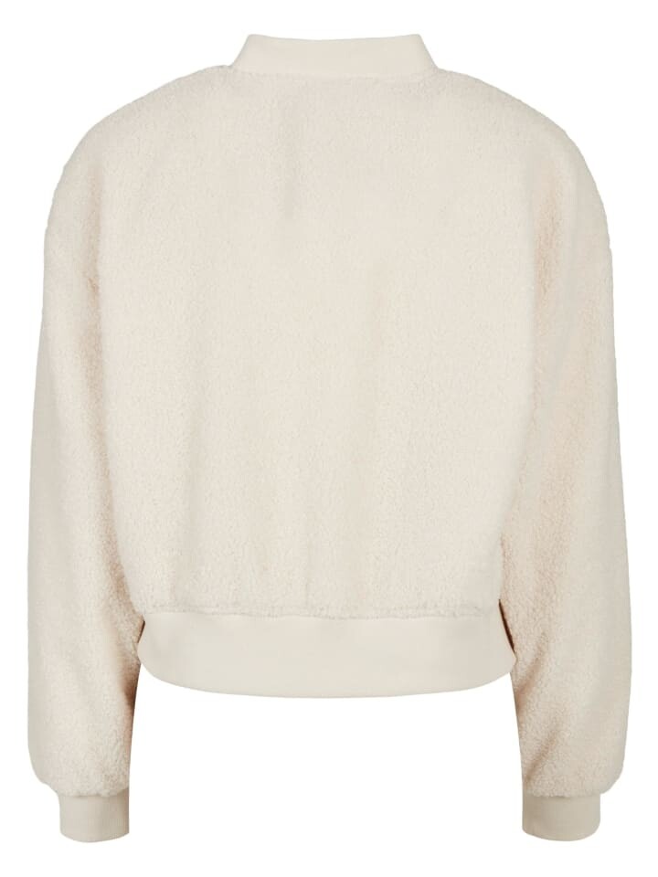 Классная вещь для прохладных дней: женская куртка сочетает в себе лаконичный стиль бомбера и пушистый материал из шерпа. В результате получается уникальная модная вещь. Куртка укорочена и застегивается на металлическую молнию. Имеет воротник-стойку в рубчик, широкие манжеты и низ в рубчик. Женский бомбер имеет крой оверсайз с широкими рукавами внахлест. Практичными деталями являются два кармана на молнии.