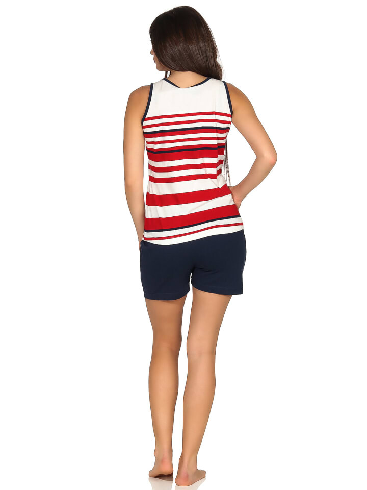 Майка пижамы в классических морских цветах: красном, белом и темно-синем, короткие пижамные штаны соответствующего однотонного цвета. Эта одежда для сна изготовлена из высококачественного хлопка. Пижаму Normann можно носить не только для сна, но и как уютную домашнюю одежду.