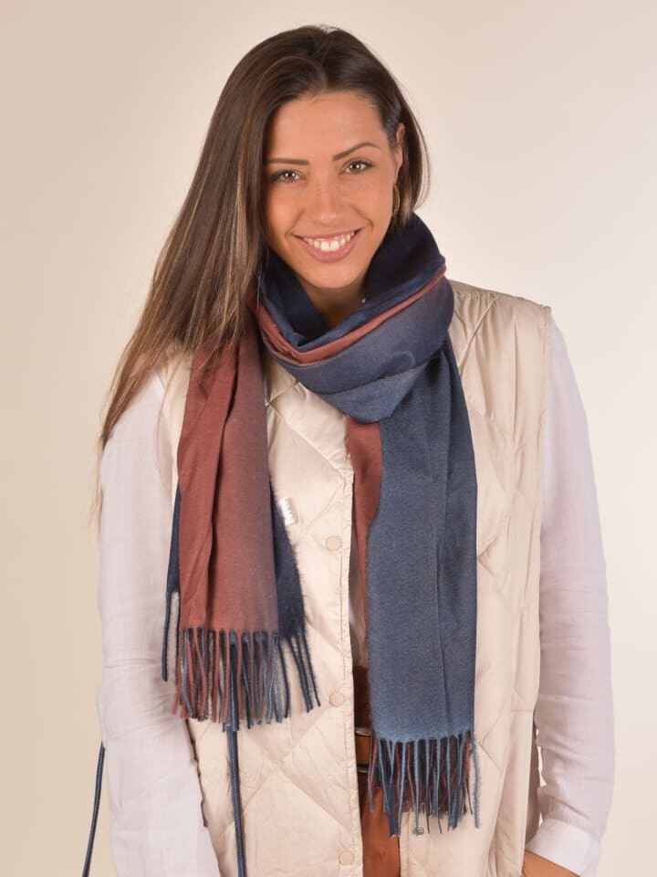 - мягкий шарф с длинной бахромой на концах и двухцветным градиентом цвета изнутри наружу на одной стороне шарфа