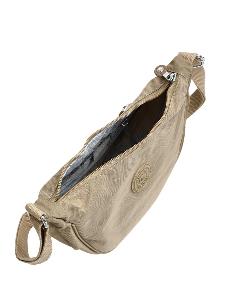 Эта сумка через плечо, имеющая форму полумесяца и один регулируемый ремень, обеспечивает универсальные возможности переноски. Основное отделение закрывается на молнию для удобства доступа. Круглая эмблема спереди придает стильный вид этому простому, но практичному дизайну, идеально подходящему для повседневного использования.
